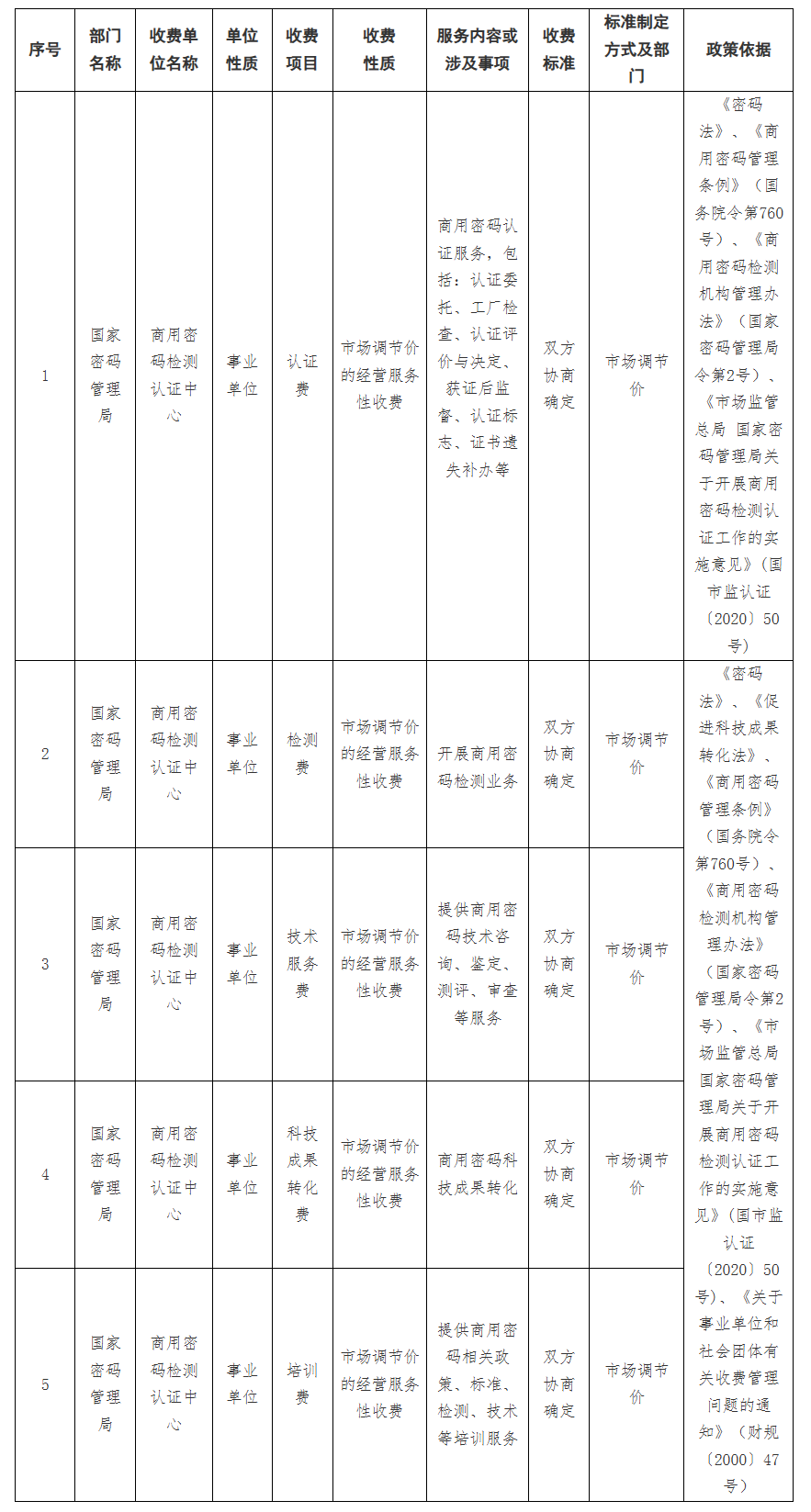 国家密码管理局及下属单位综合性涉企收费目录清单