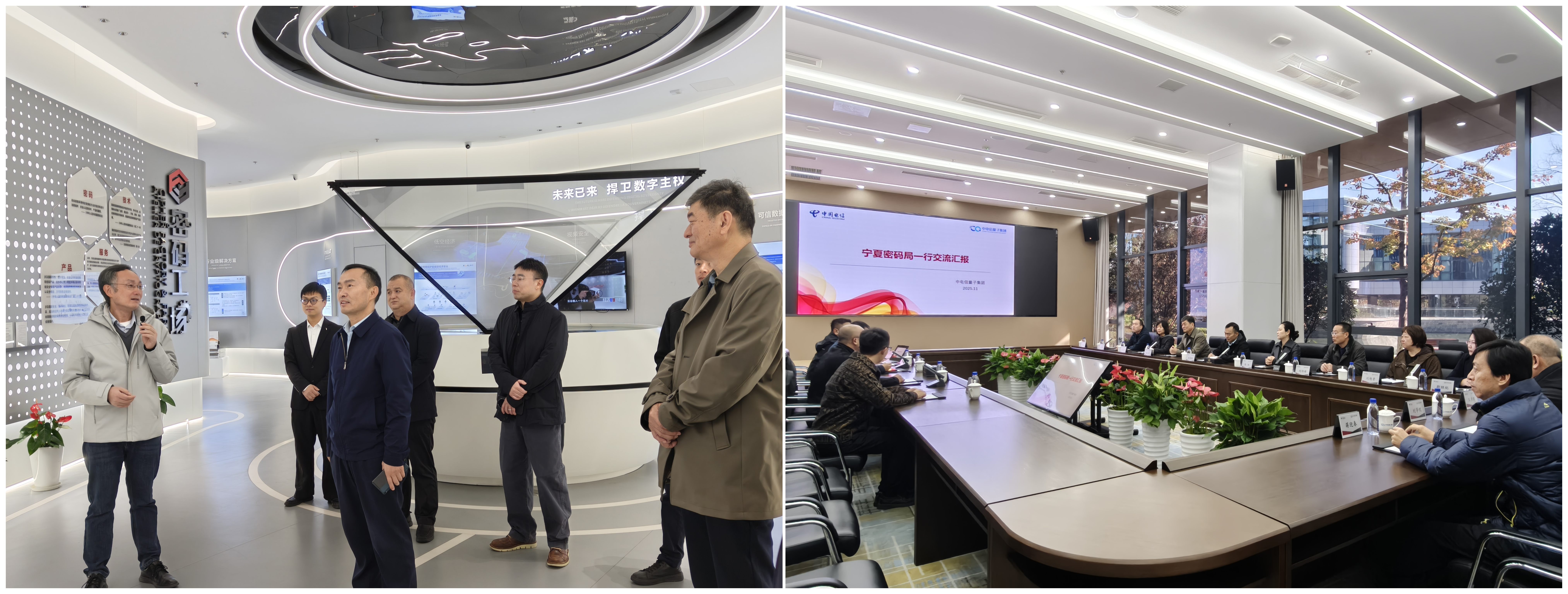 调研组坚持聚焦商用密码前沿科技、产业发展态势与人才培育等内容,赴安徽合肥市调研中电信量子集团、国盾量子公司和中科大先进技术研究院,聚焦量子通信、量子计算、量子精密测量等前沿技术和商用密码创新发展,了解密码科技与量子技术、人工智能、物联网等新兴技术的融合应用以及对传统密码学的颠覆性影响。赴上海松江区调研G60商用密码产业基地,了解商用密码产业生态构建、前沿技术展示、产学研融合交流和技术创新与应用等。11月20日,参加了安徽省“2025量子科技和产业大会”,参观了量子科技和产业成果展。